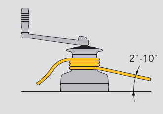 Le cordage doit arriver sur la poupée avec un angle d’inclinaison compris entre 2 et 10° par rapport à l’horizontale. Il est important sur les winchs 2 vitesses, que le pignon qui entraîne la poupée soit positionné sur l’axe perpendiculaire à l’axe de traction du cordage, comme illustré dans le schéma (90°).