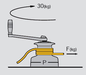 Pour calculer la force maximale du winch (F), il faut en premier lieu déterminer sa puissance (P) à l’aide des tableaux. En tenant compte d’une efficacité égale à 70% et d’une force maximale de 30 kg sur la manivelle, la force maximale se calcule comme suit : F = 20 x P (Kg), c’est-à-dire 20 fois la puissance du winch. Par exemple la force maximale d’un winch de puissance 40 sera : F = 20 x 40 = 800 Kg.