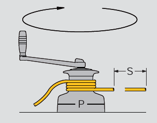 La vitesse d’enroulement correspond à la longueur de cordage enroulé sur la poupée en un tour de manivelle. Cette longueur est la réciproque de la puissance et peut se calculer comme suit: S = 1600 / P (mm). Par exemple, à un winch de puissance 40 correspond la vitesse S = 1600 / 40 = 40 mm par tour de manivelle. Les tableaux page suivante, indiquent les valeurs S1 et S2 correspondant aux vitesses rapide (1) et lente (2).