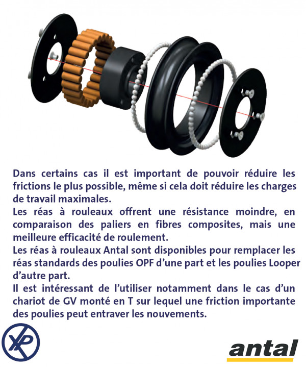 - Réa en résine avec palier en fibres composites et double roulements latéraux