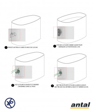 Il suffit de percer la paroi avec un trou d’un diamètre approprié (30, 35 ou 40 mm selon le modèle), d’insérer le filoir dans le trou et de le fixer avec les deux vis (fournies).