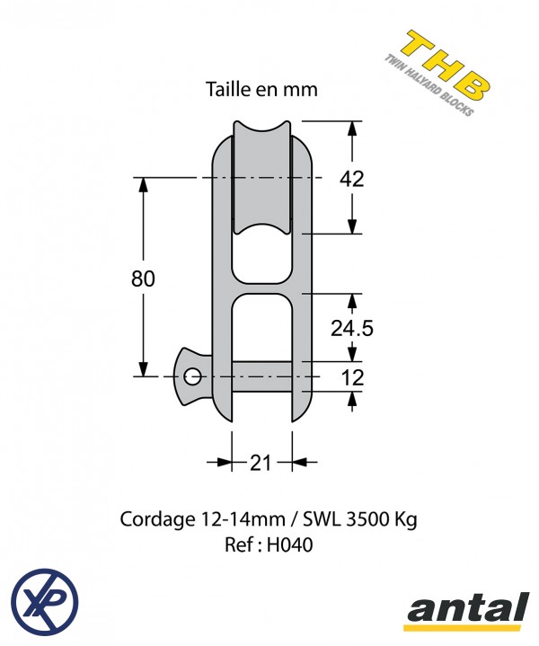 H040 - Poulie de drisse moufflée Avec Réa 39 Mm - Mouflage 2:1 - Ø 12-14 Mm. - SWL 3 500 Kg.