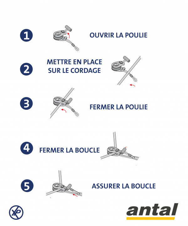 La poulie ouvrante Antal à joues pivotantes est fabriquée en résine chargée de fibres. Elle est fournie avec une boucle Dyneema démontable protégée par une gaine polyester. Cette solutionlégère, simple et fiable permet une fixation rapide
