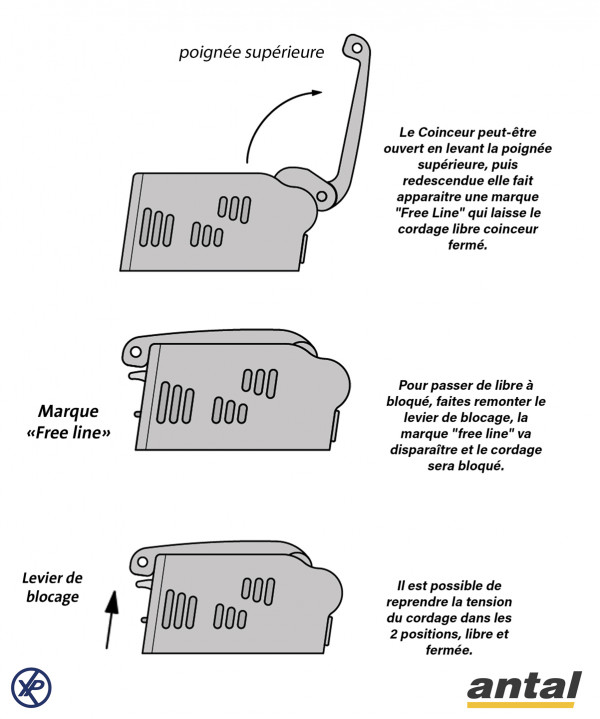 1- le Coinceur peut-être ouvert en levant la poignée supérieure, puis redescendu elle fait appraiître une marque ""free line"" qui laisse le cordage libre bien que le coinceur soit fermé
